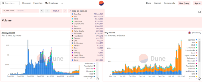 2022 年 10 月 20 日,Blur 正式上线。据 Dune Analytics 数据显示,10 月 31 日,Blur 周交易已经超过 Opensea。在此之前,没有一个交易平台的周交易量达到过 Opensea 的 1/2。2 月 22 日,Blur 当日交易量 1.15 亿美元,而 Opensea 则不到 1500 万美元。