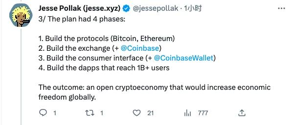 一是(帮助)构建协议,比如比特币、以太坊; 二构建交易所,也就是你们熟知的 Coinbase; 三是构建用户工具,比如 Coinbase Wallet; 四则是打造可承载 10 亿用户的 Dapps;该计划的**愿景是通过开放式的 Crypto 经济来提高全球的经济自由度。