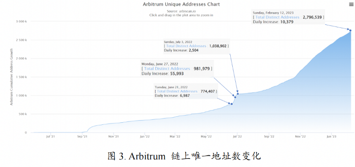 根据浏览器上的数据显示,自 6 月 21 日奥德赛活动开始到**周任务结束时,Arbitrum 的新增地址达 20.7 w 个。并在 6 月 27 日单日新增达到了 5.5 万个,成为单日新增地址最多的一天。可见奥德赛活动之成功。