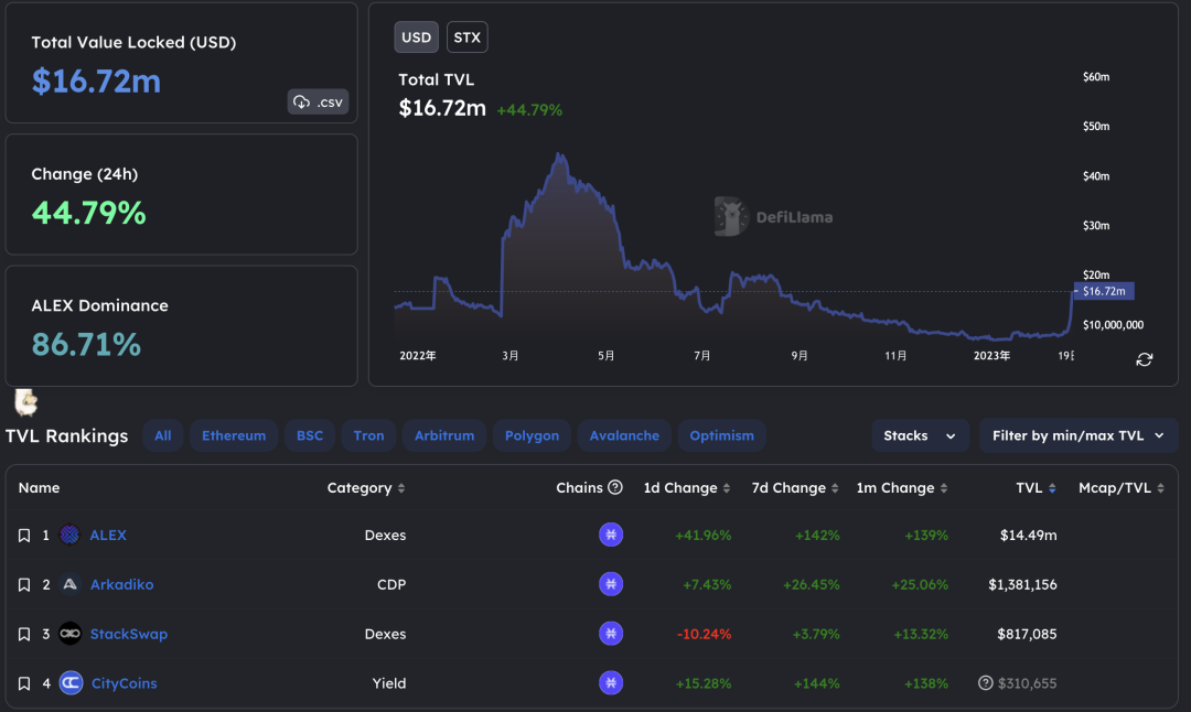 不过Stacks上总的TVL并不大,目前总量不到2000万美元,号称比特币上**个一站式完整 DeFi 服务平台的Alex贡献将近90%。