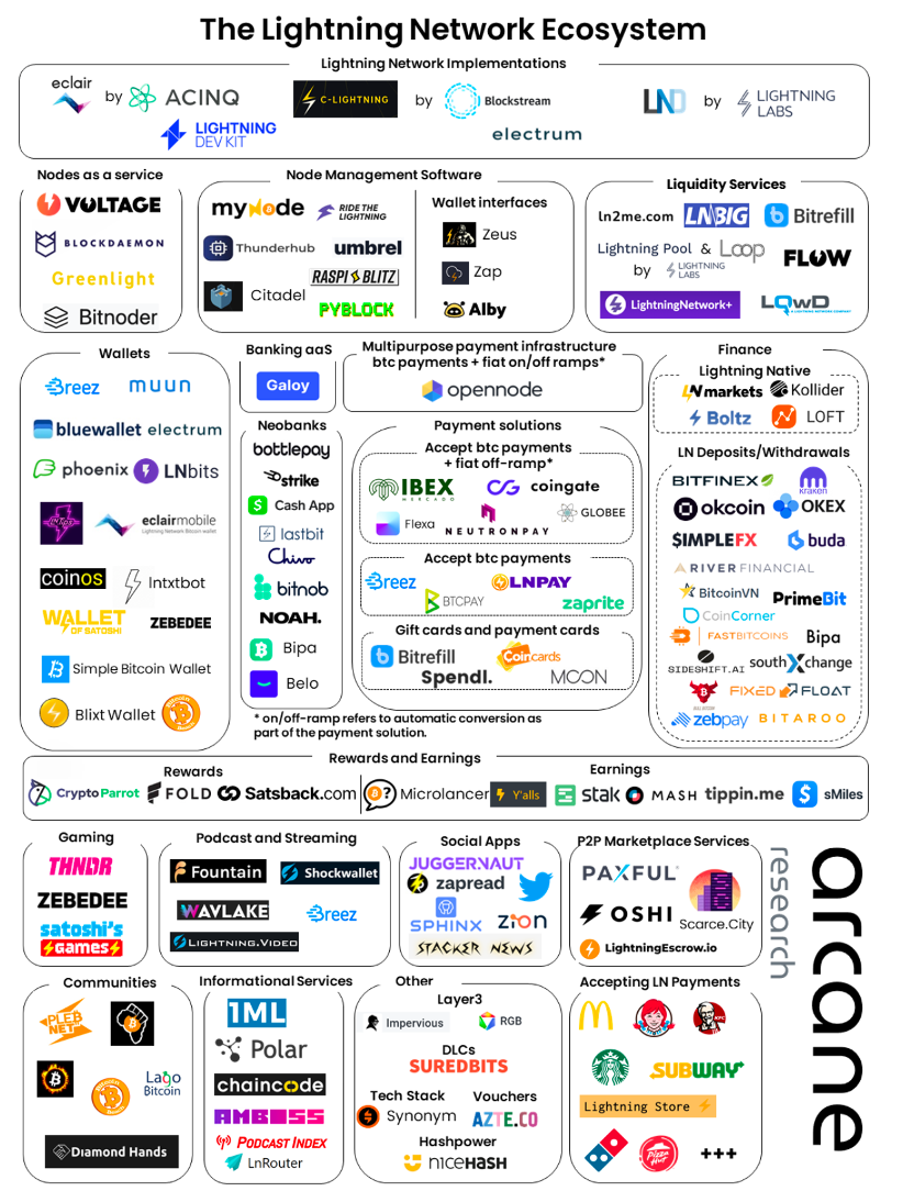 目前,闪电网络的生态发展得已经相当丰富,包括闪电网络节点和流动**、钱包支付应用、以及游戏、社交网络、零售场景等等。