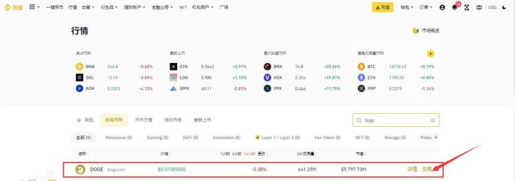 8、在搜索框输入DOGE,选择DOGE/USDT交易对,可以看到DOGE实时行情