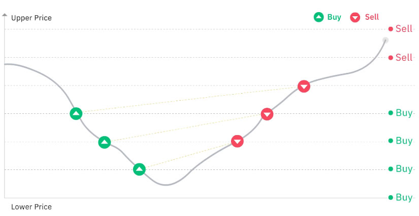 现货网格机器人旨在在预定价格区间内低买高卖。它将您的投资分成多个小订单,以较低的价格下达买入订单,并以较高的价格下达卖出订单。借助这种方法,交易者无需预测确切的价格走势也能从市场波动中获利。