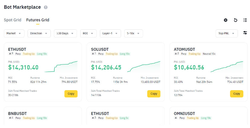 在交易机器人落地页上,您可以找到机器人市场。它让用户能够复制现有策略的机器人参数,并涵盖币安现货和合约上**门的网格交易策略。在“现货网格”或“合约网格”选项卡中,使用“市场”、“收益率”和“运行时间”等筛选条件,即可对选项进行筛选。