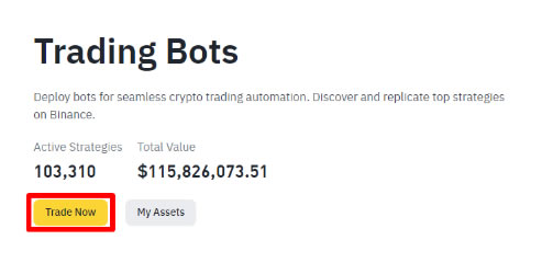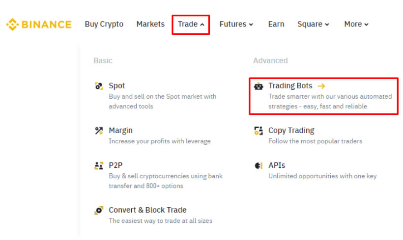 1. 登录币安账户(官方注册 官方下载),前往【交易】菜单,然后前往【交易机器人】。