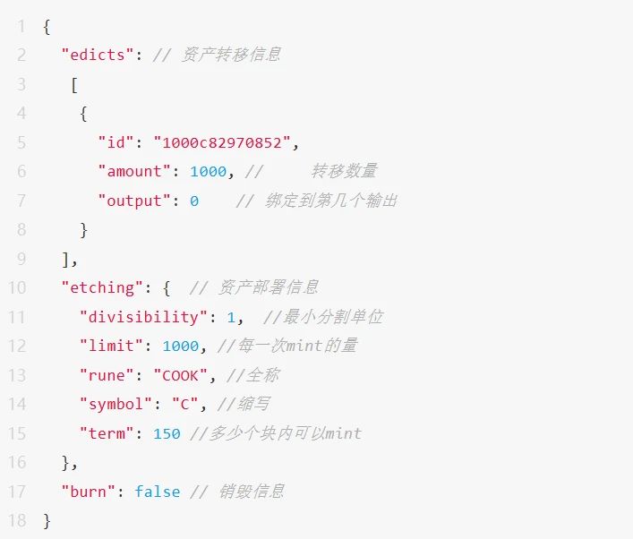 最初的 Runes 整体的字段分成 3 个部分,edicts( 资产转移信息),etching( 资产部署信息),burn(销毁)。