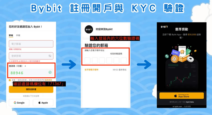 先点击Bybit 开户链接(用电脑或手机都行),接着完成以下三个步骤: