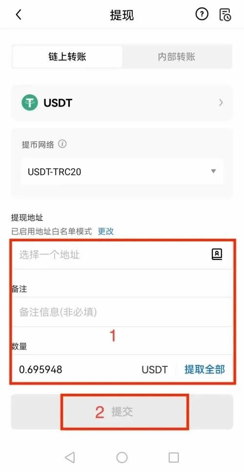 - 提币白名单模式下,用户不可提币到手动输入的新地址,只能提币到地址簿内的地址。关闭白名单模式后,“手动输入新地址”功能即可恢复。