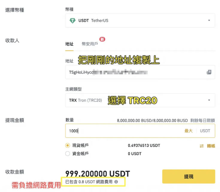 接着贴上你要转帐的地址,选择TRC20(两边区块网路**要一样),输入金额后按下提交即可。