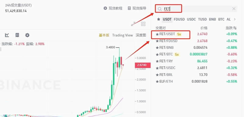 7、搜索币种简称【FET】,选择【FET/USDT】交易对