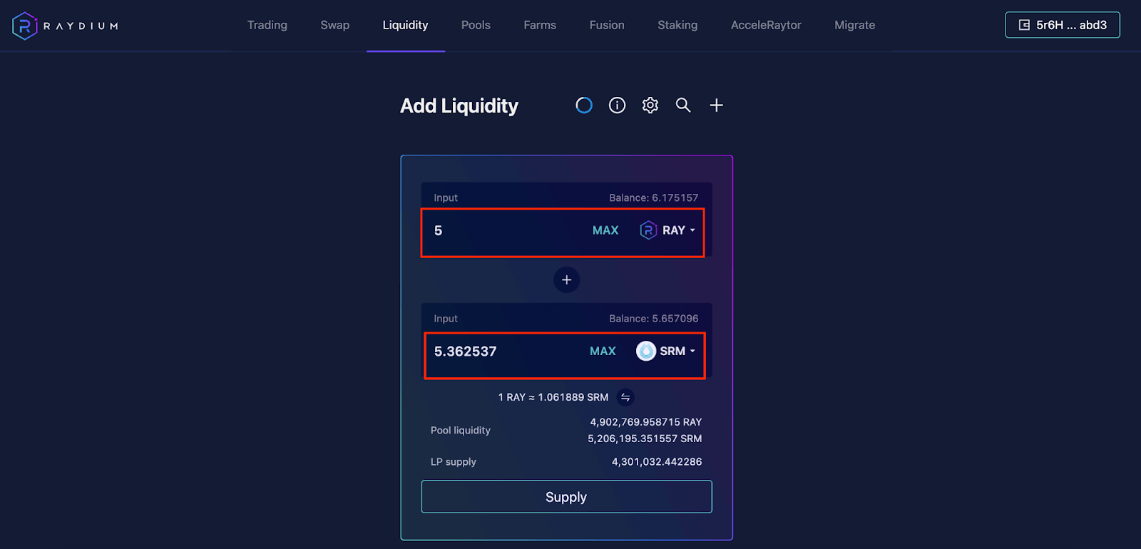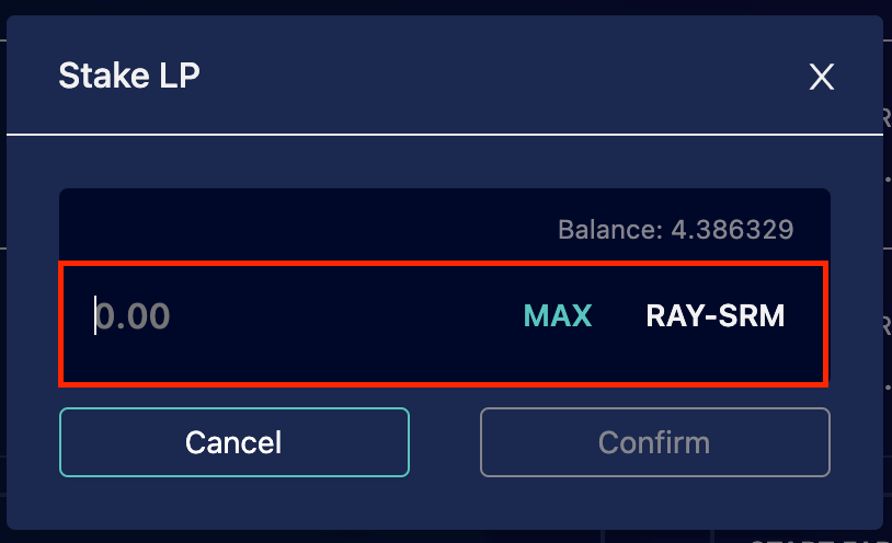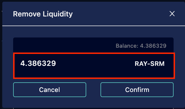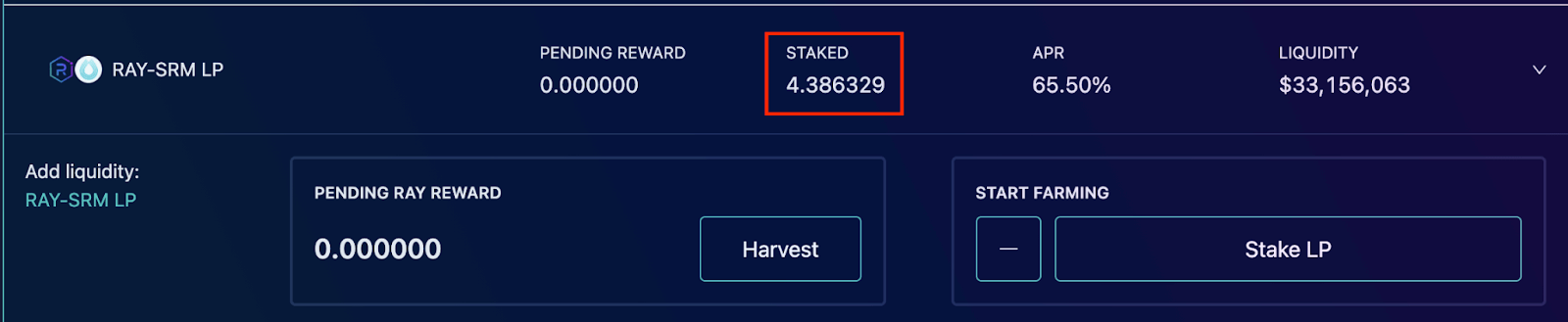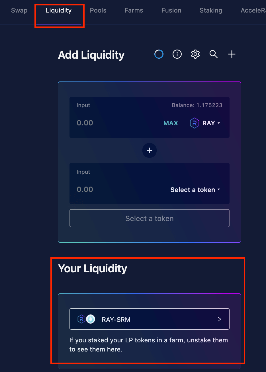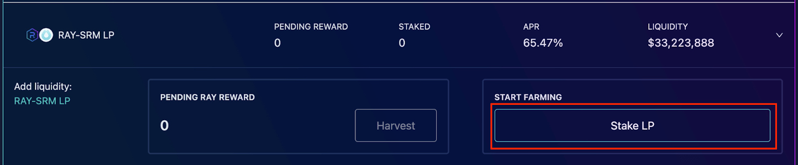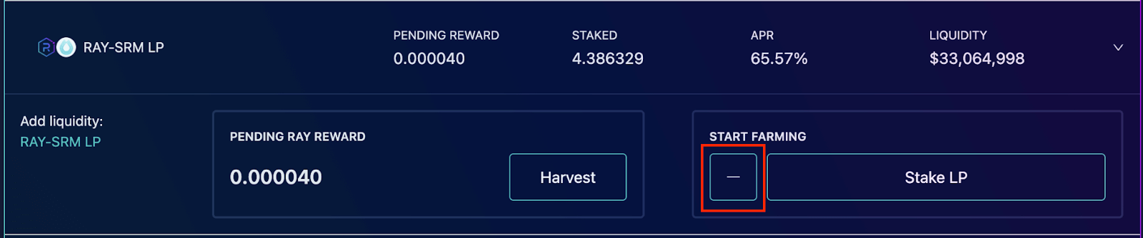 Farm 跟Fusion 提供流动性的方式是一样的,因此这边一起说明,这边以Farm 的RAY-SRM LP 为例。