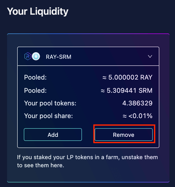 接着到Liquidity 的页面往下拉,就可以看到Your Liquidity,这边显示的是你目前所持有的LP,点选RAY-SRM。