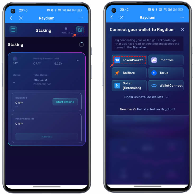 2、**使用Raydium需要点击界面右上角的菜单,在连接钱包界面中选择TokenPocket。