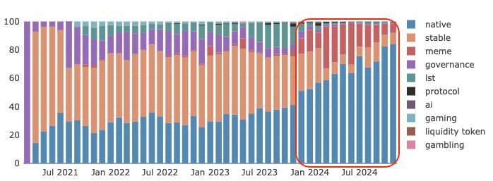 根据图 9 的数据,在 Raydium 上交易的**种类中,原生**为**宗,但从一月开始可以发现迷因币的交易权重大幅增加,这无疑是 泵乐 所带来的助益。根据 pump.fun 的玩法,**在 pump.fun 市值达到 69k 的迷因币,Raydium 会自动为其创建池子,并存入 12k 作为初始流动性。因此,只要从 pump.fun 出来的迷因币具有**的热度,Raydium 便可以自动吃到其交易量所带来的收益。