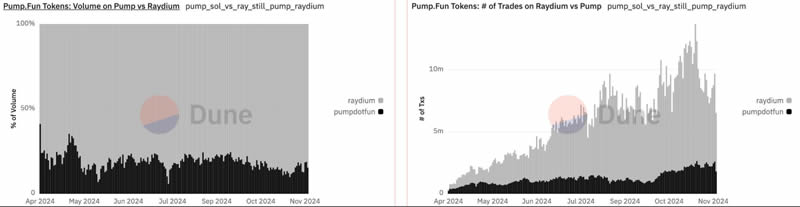 (图 10、从 pump.fun 发射的迷因币在 pump.fun 和 Raydium 的交易量比较,来源:Dune)