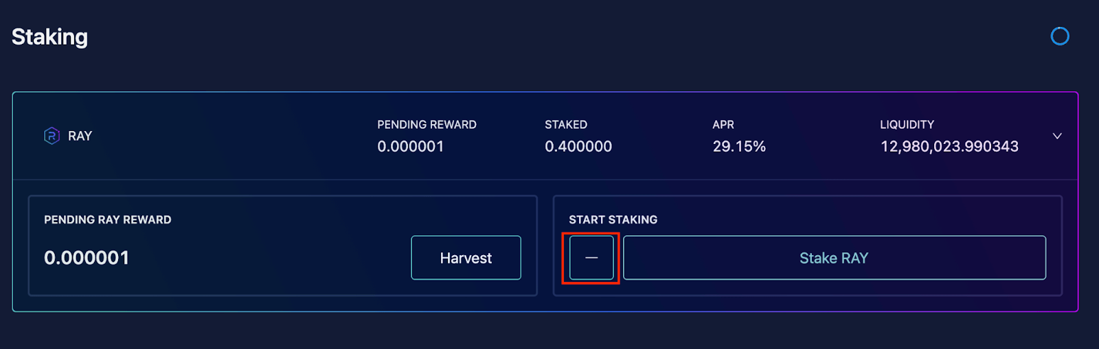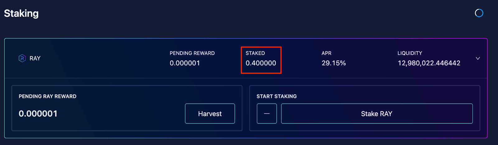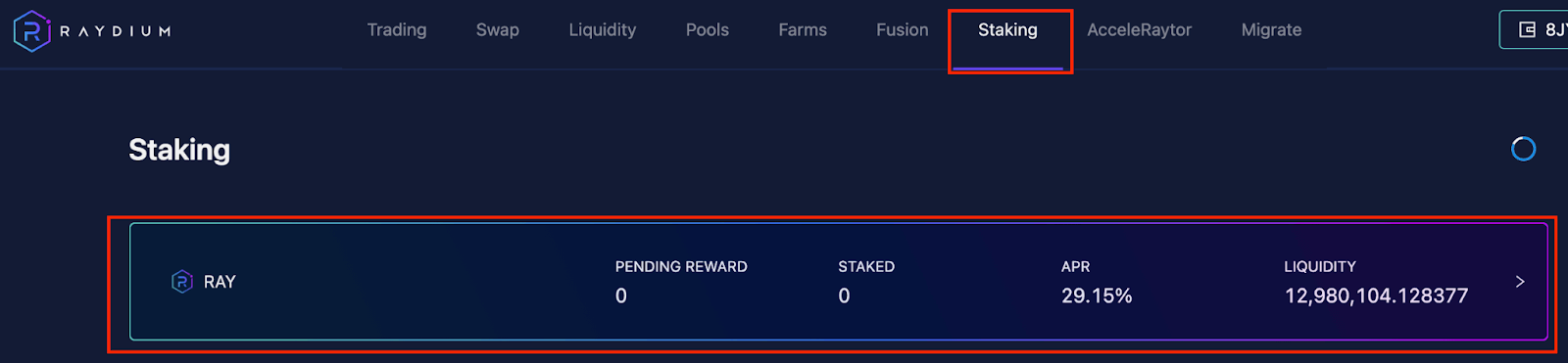 在Staking 的页面下找到RAY 并点开。