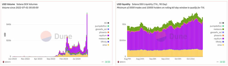 (图 6、Solana DEX 的每日交易量和过去 90天的 TVL,来源:Dune)