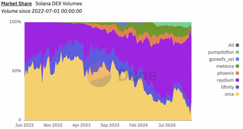 (图 5、Solana DEX 的市场份额,来源:Dune)