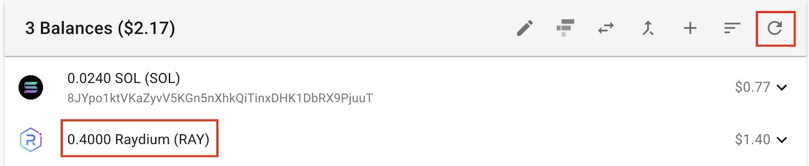 接着在钱包中就可以看到兑换的RAY 啰,如果没有显示,可以按右上角红框处的图示刷新。
