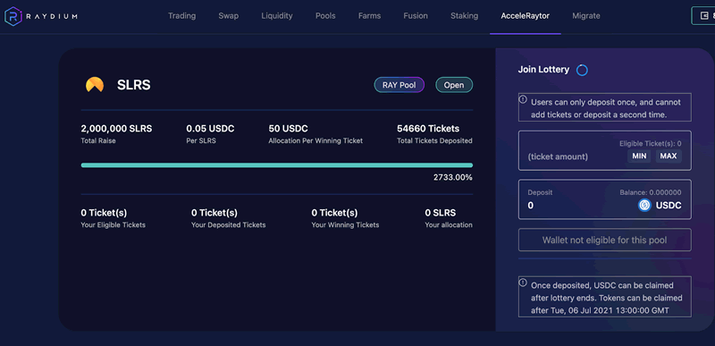 关于Raydium 上的IDO,近期由之前的人人有奖平分制,改成乐透制,主要的规则是根据Stake RAY 的数量与时间来决定Tickets 的数量,这次刚结束的SLRS IDO 的规则为: