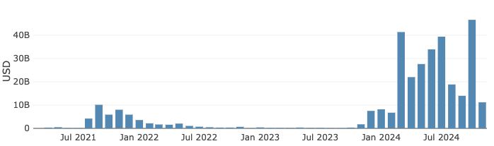 (图 8、Raydium 每月交易量,来源:Raydium Analytics)