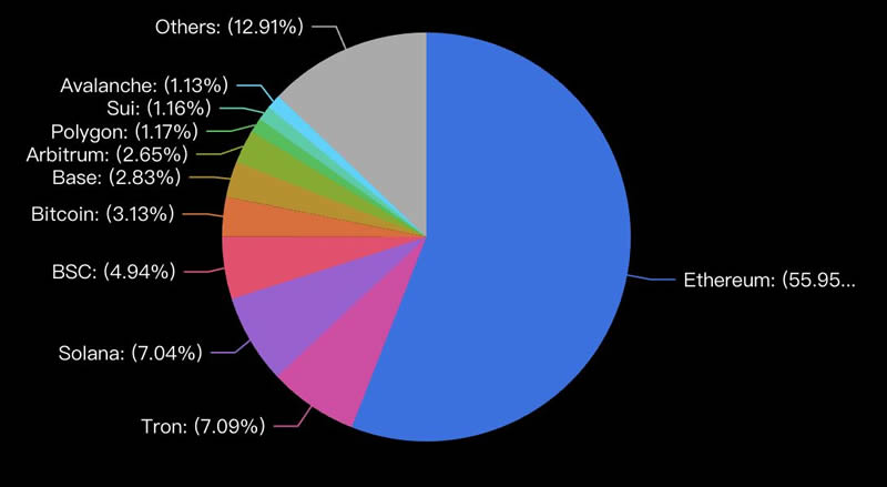 (图 3、各个公链的 TVL 在整体市场的占比,来源:DefiLlama)