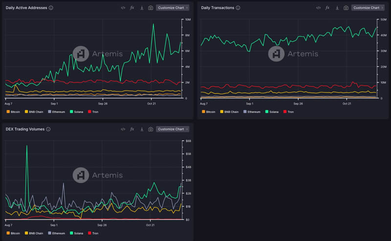 (图 4、TVL 前五名公链的每日活跃地址数、每日交易量和 DEX 交易量,来源:Artemis)