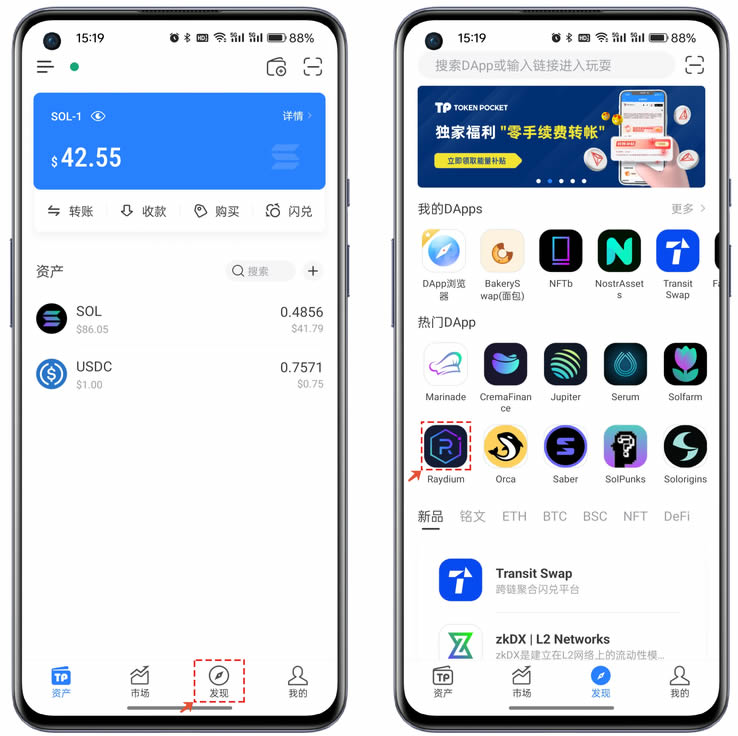 1、打开TokenPocket,点击底部【发现】菜单,在【热门DApp】中打开Raydium。