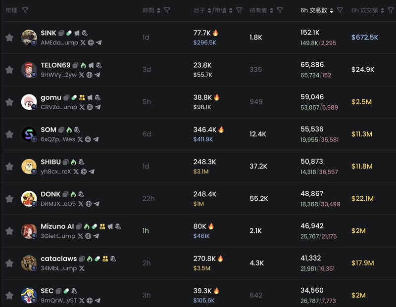 在 Raydium 上,不论是资金体量或是用户数量都比 pump.fun 高出许多,市场更加庞大,所以参与交易的金额也更多。从图九GMGN 的面板便可以发现,热门的迷因币在短时间内的交易量动辙就是上百万美元起跳,而叙事**和有稳固社群共识的迷因币甚至可以突破更高的市值,像是POPCAT (1.5B)、GOAT (746M)、MOONDENG (218M) 等等。
