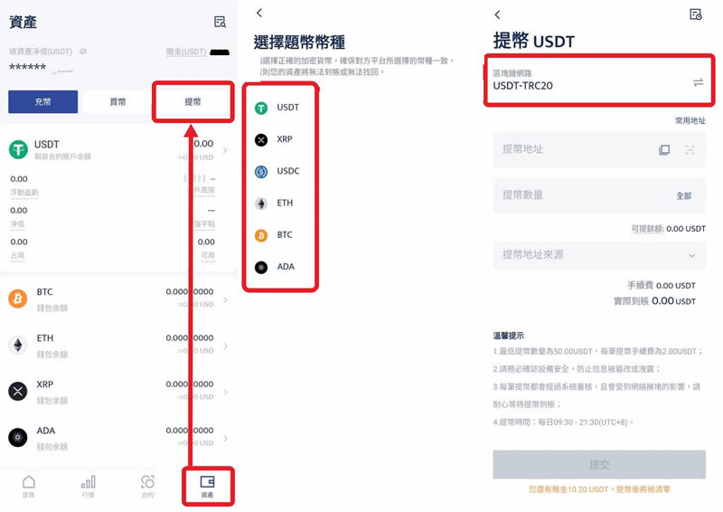 点选左下角「资产」,并点「提币」,再选择「USDT」。然后把刚刚在派网复制的地址贴到提币地址栏位,并确认上方蓝色的框框是TRC20。输入要提领的数量后,**按「确认提币」转帐就完成了,接下来只需要等待区块链验证到帐即可。