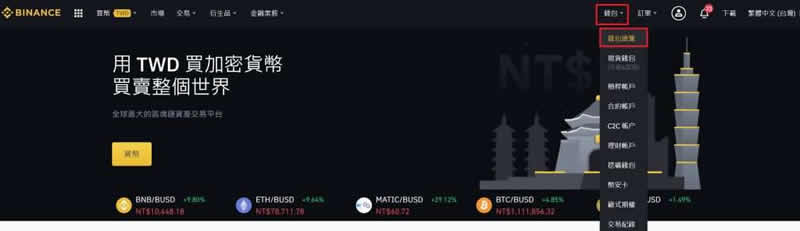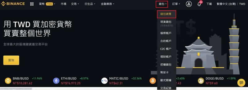 步骤三:进入币安官网,点选右上角的钱包,点选「钱包总览」。