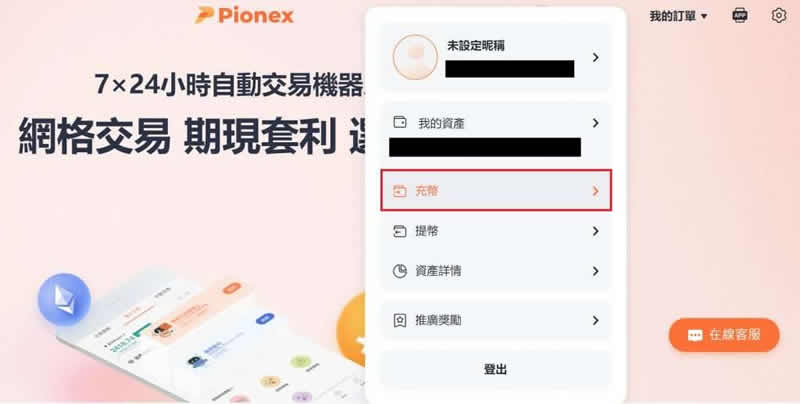 步骤一:进入派网官网后,点选右上角的帐户昵称,未设定的话会显示为「未设定昵称」,选择项目栏中的「充币」。