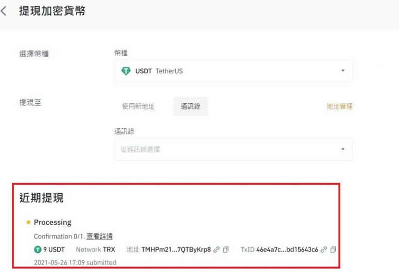 步骤四:成功转帐后,你可以在下方的「近期提现」看到自己的交易纪录,以及目前这笔转帐的处理进度如何。 (不查看也一样能够成功转帐)。