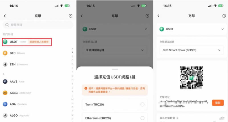 步骤二:进入充币页面后,你需要选择以上说的三种主网以及入金的货币。这边示范USDT(Tether),使用TRC20 这个链入金。