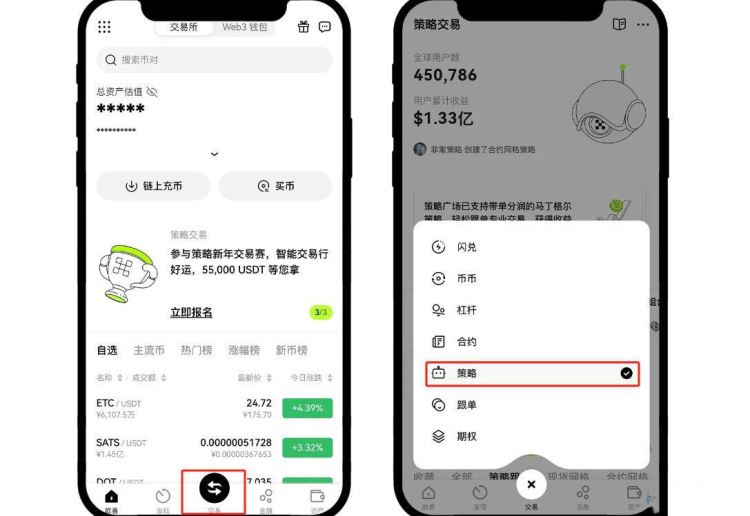 1、以BTC/USDT为例:在欧易APP(点击注册)首页点击【交易】-【策略】