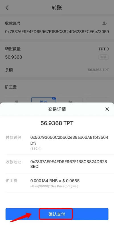 4、依次填入【收款账号】和【转账数量】,选择矿工费,然后点击【确认】;