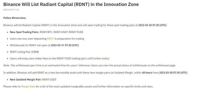 2023 年3 月30 日,全球**的加密货币交易所币安(Binance)发步公告表示,将在台湾时间3 月30 日15:30 在创新区上架Radiant Capital(RDNT),并开放RDNT/BTC 、RDNT/USDT、RDNT/TUSD 现货交易对。