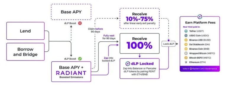 Radiant Capital 允许其用户从主要区块链存入资产,并允许其他用户在不使用中间人的情况下借用这些资产。那些向平台贡献资金的人可以获得有吸引力的收益。此外,Radiant Capital 的收入还来自锁仓费和**费。 Radiant Capital 还通过一键循环提供自动存款。
