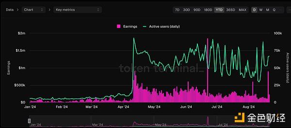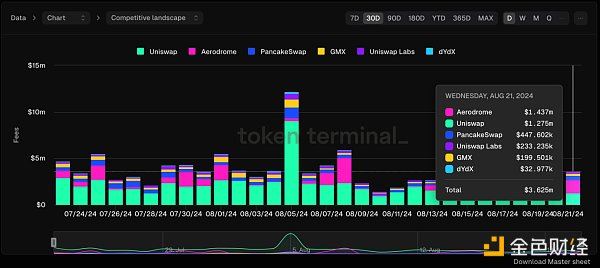 以Uniswap为例,其自三月以来收益大幅增长,而日活跃用户数受行情热度变化影响,在3万至10万之间波动(下图1),但是Uniswap的统治地位受到了Aerodrome的挑战(下图2)。