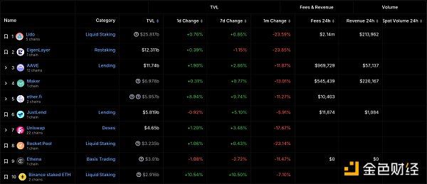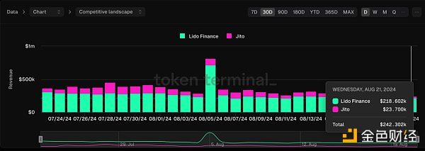 **数据显示,Lido目前占据流动性质押赛道近70%的份额(下图1),在收入层面,Lido占据近80%的赛道收入(下图2),Lido依靠着先发优势保持**地位,但由于与ETH的高度相关性,与去年同期相比币价仍回调31.2%,DeFi整体表现与ETH高度绑定。