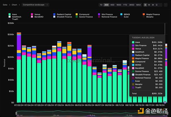2. 强劲的增长数据:尽管市场波动,Aave收入和TVL在熊市后依然回升,表现出显著的增长潜力。在过去30天中,平均收入占据了借贷市场收入的55%。