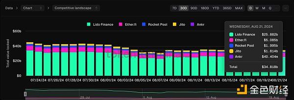 我们再来观察流动性质押赛道龙头Lido,其表现与以太坊息息相关,Lido允许用户在不锁定资产的情况下质押 ETH,并获得 stETH 作为流动性**。其关键特点包括通过去**化节点运营商网络来确保网络安全和稳定,但其过高的市场份额引发了**化的争议。虽然 Lido 在技术和安全性上表现出色,但未来需要引入更多节点运营商以减少**化风险。Lido 还面临来自其他质押服务的竞争,尤其是**化交易所质押的挑战。
