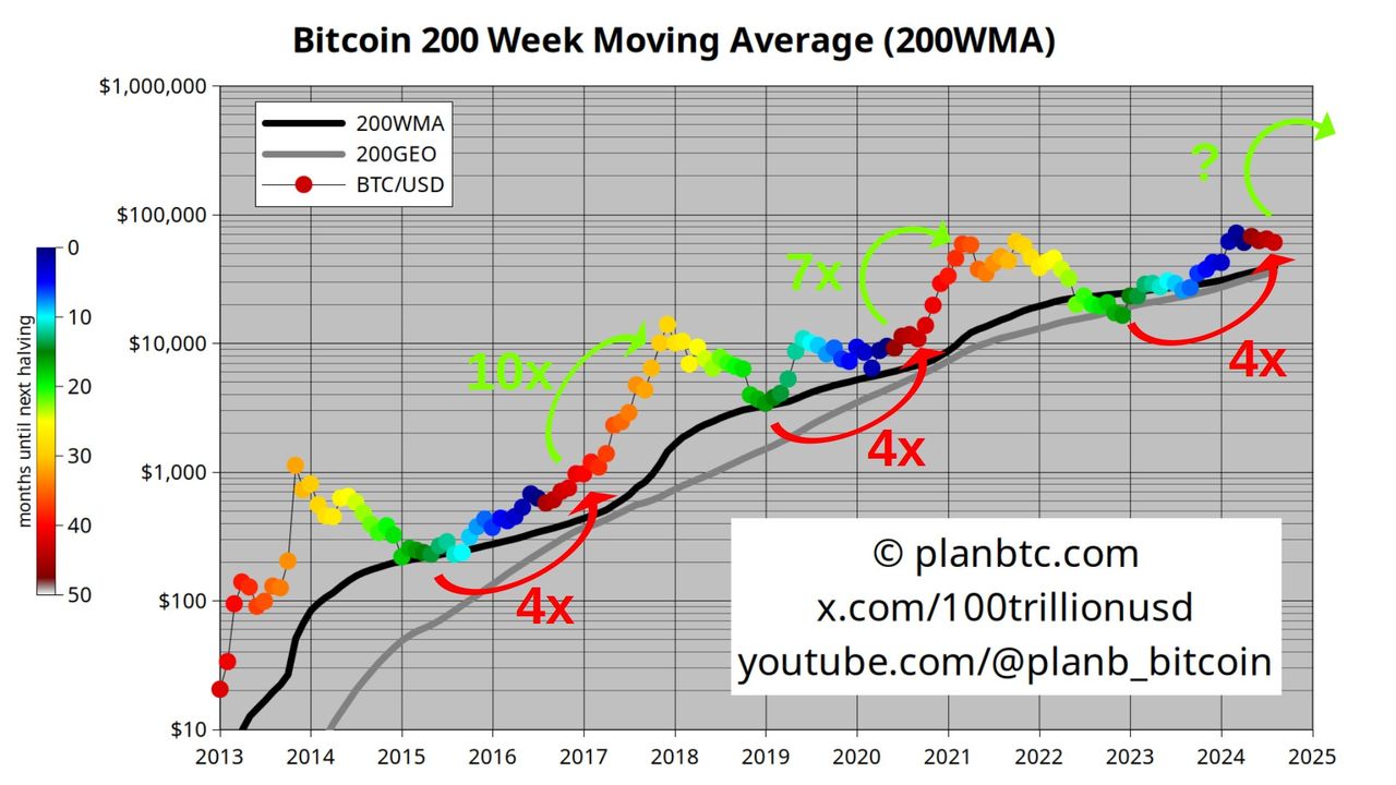 PlanB 的 200 周移动平均线(200 WMA)是一种用于分析比特币长期趋势的关键指标,经常被视为市场中的重要支撑和阻力水平,同时也是衡量市场情绪变化的有效工具。在 2018-2019 年的熊市以及 2020 年因 COVID-19 导致的市场波动期间, 200 WMA 表现出其作为重要支撑线的显著作用。即便在 2021 年的牛市中,比特币价格虽然经历了多次回调,但每当价格接近 200 WMA 时,都会受到有效支撑,并重新进入上涨通道。