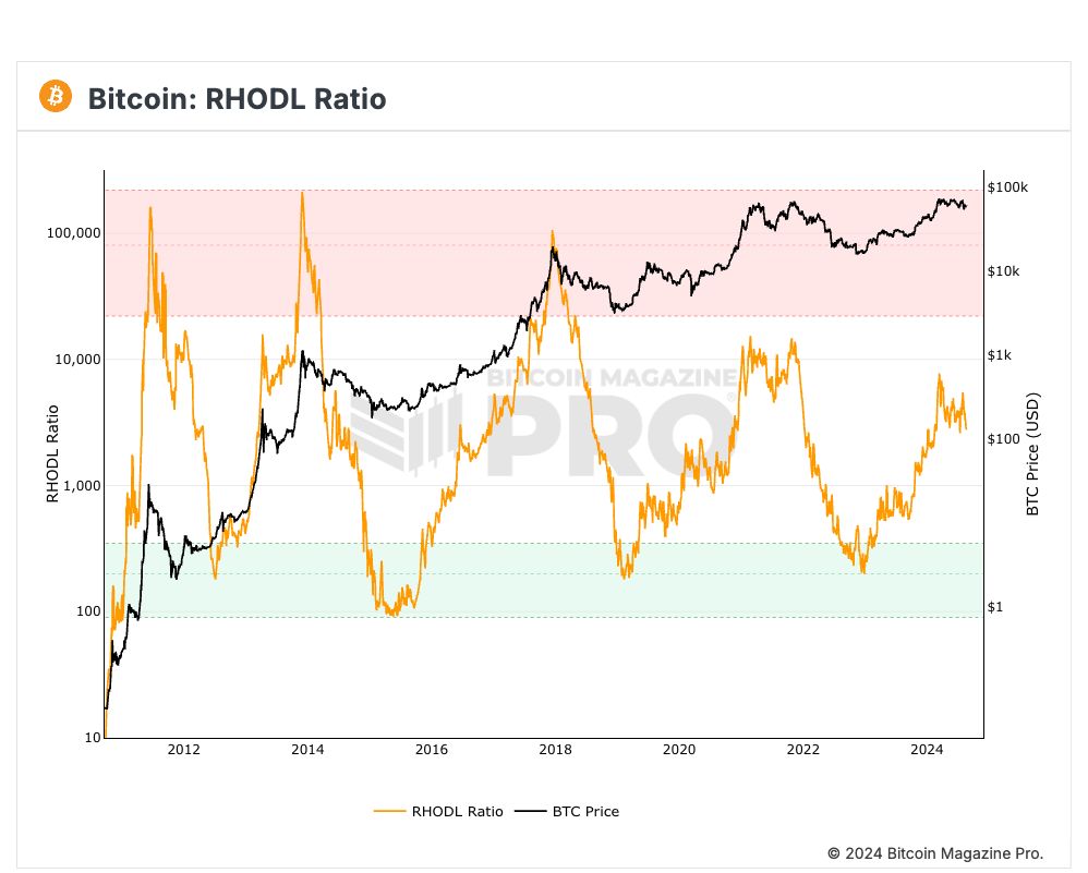 RHODL(Realized HODL)Ratio 由博主 Philip Swift (@positivecrypto) 于 2020 年 6 月份创建,是一种用于评估比特币市场中投机活动和持有者行为的重要指标。它通过比较不同持有时间段的比特币数量,特别是短期(1 周至 1 个月)和长期(1 年到 2 年)的 UTXO(未花费的交易输出)数量,来衡量市场的活跃度和投机性。具体而言,RHODL Ratio 通过将长期 UTXO 数量与短期 UTXO 数量相除得出,较高的比例通常意味着短期持有者数量较多,暗示市场可能存在更强的投机行为;相反,较低的比例则表明长期持有者占比更高,市场相对稳定。