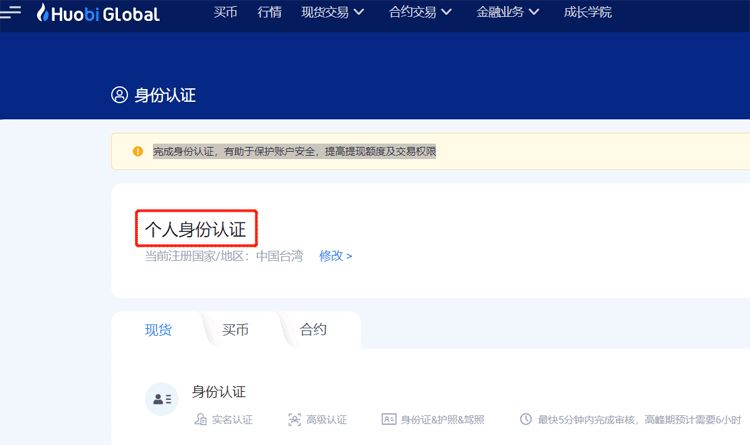 网页端位置:登录火币网,“交易**”-“安全**”-“实名认证”