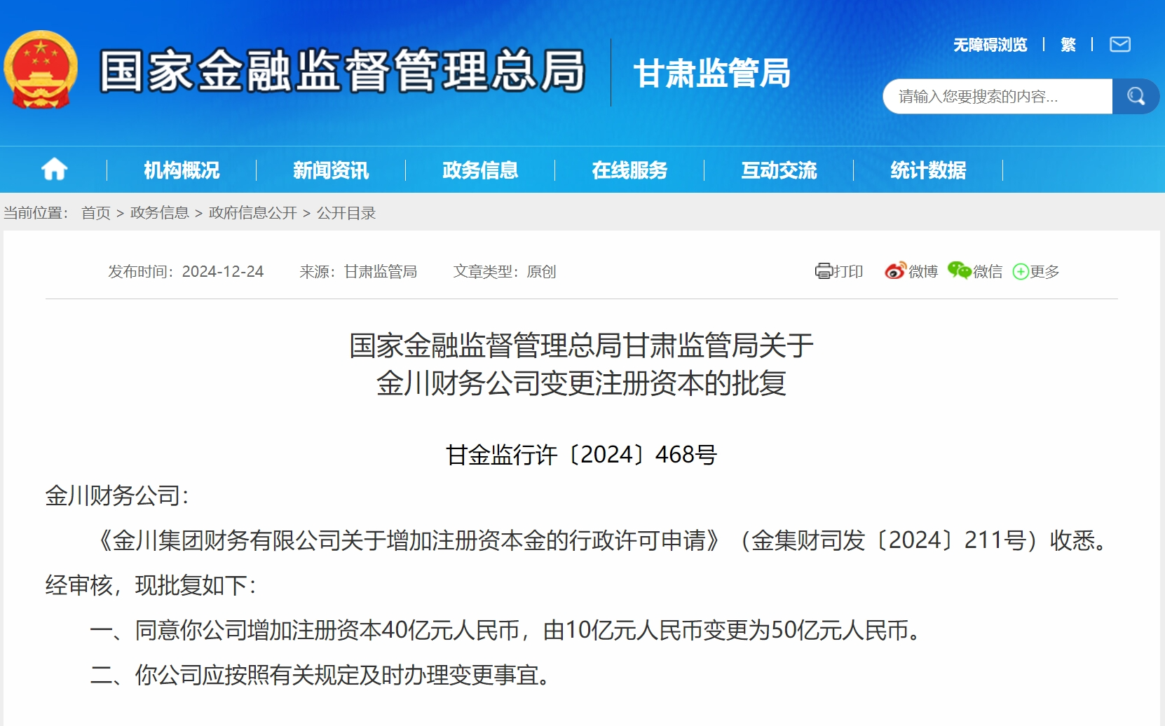 财经12月25日讯 昨日,**金融监督管理总局甘肃监管局发布相关批复,同意金川集团财务有限公司(简称:金川财务公司增加注册资本40亿元人民币,由10亿元人民币变更为50亿元人民币。以下是相关批复正文: