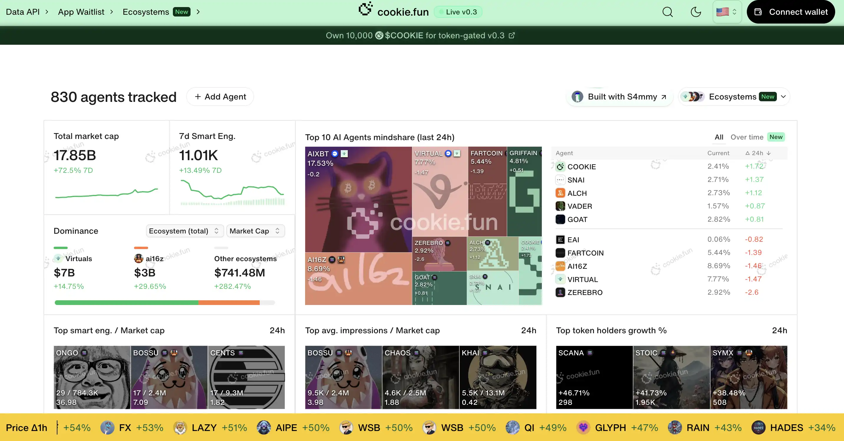 Iman:最近随着 Cookie.Fun 的上线,它的定位发生了**转变,市场情绪也随之逆转。核心功能主要是聚合数据源,然后让所有的 AI 代理在心智份额、市场份额等方面进行对比和竞争。