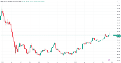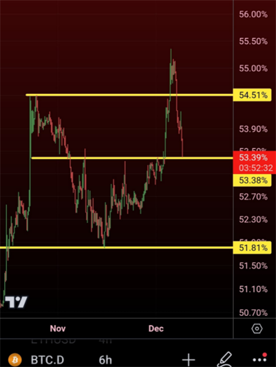 海兰提到了比特币主导地位最近飙升的情况,12 月 6 日比特币的主导地位达到了 55.26%,这是自 2021 年 4 月以来的**水平。随后迅速扭转,上涨势头放缓,截至发稿时比特币的主导地位为 53.4%。