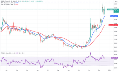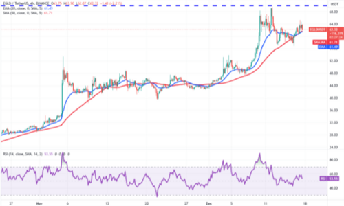 20天EMA的反弹表明,市场情绪依然看涨,交易员纷纷下跌买入。多头将试图将价格推至70美元,这仍然是短期内需要小心的关键阻力。如果买家克服了这一障碍,埃格尔德/尤德特这对组合可能会加速势头,反弹至90美元,随后反弹至100美元。