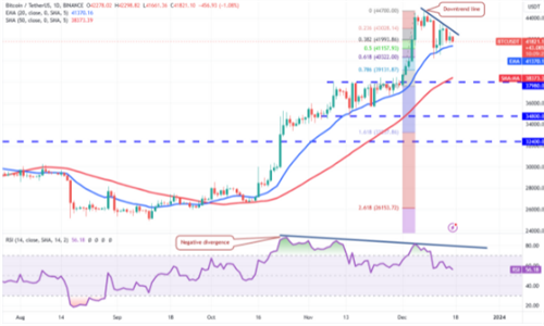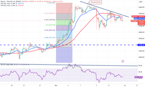 比特币正被挤在20天指数移动平均值(41370美元)和下降趋势线之间。这为在接下来的几天内发生一次剧烈的突破做好了准备。